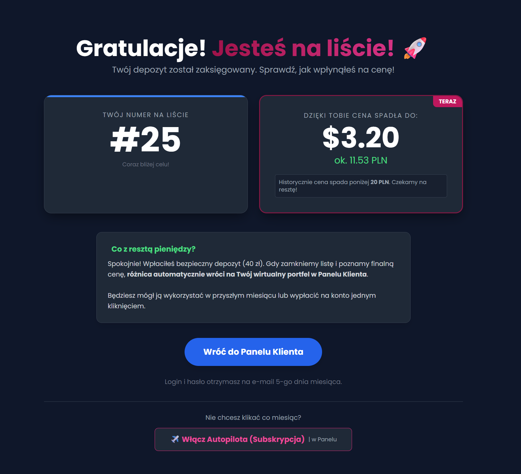 Im więcej nas jest, tym mniej płacisz. Po wpłacie zobaczysz swój numer na liście oraz aktualną prognozę ceny. To czysta matematyka!