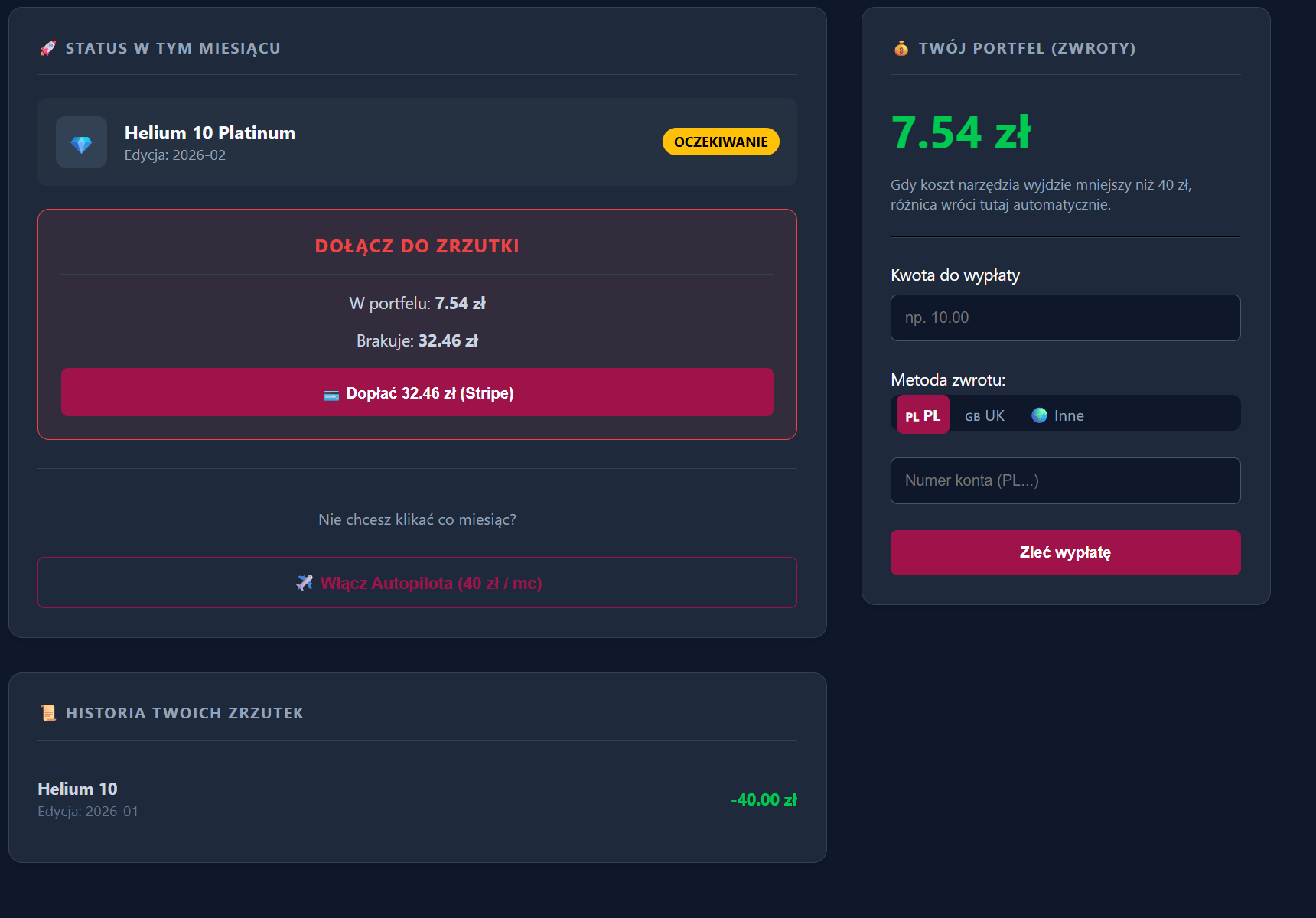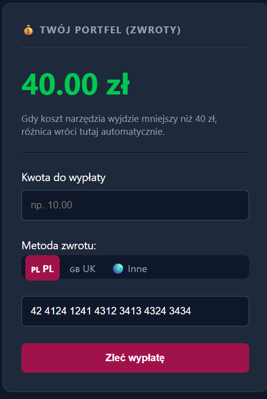 Narzędzie kosztowało 15 zł, a wpłaciłeś 40 zł? Różnica (25 zł) automatycznie wraca na Twój wirtualny portfel w Panelu. Możesz ją wykorzystać w następnym miesiącu.